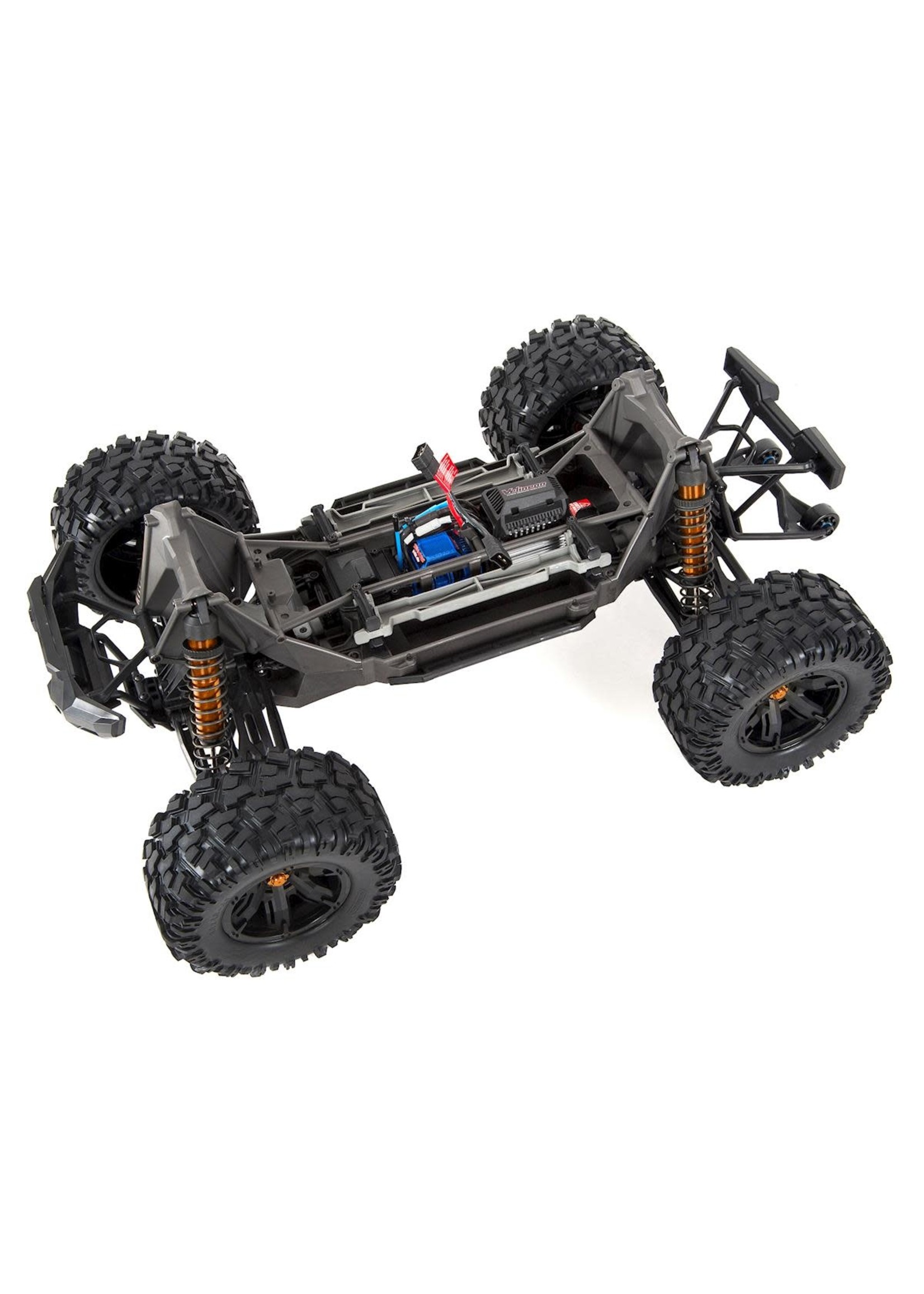 Chassis: Composite nylon tub, modular design provides easy access to critical components, lower front and rear skids and integrated nerf bars for front, rear and side impact protection, rear wheelie bar Drive Four wheel shaft drive, Max Duty drivetrain with new high-strength precision steel gears, new ring and pinions use a larger module and special alloys, new impact absorbing Cush Drive handles massive torque and replaces the slipper clutch new Torque-Biasing Center Drive with cast alloy construction is tuned for instant punch off the line, and improved front and rear power distribution